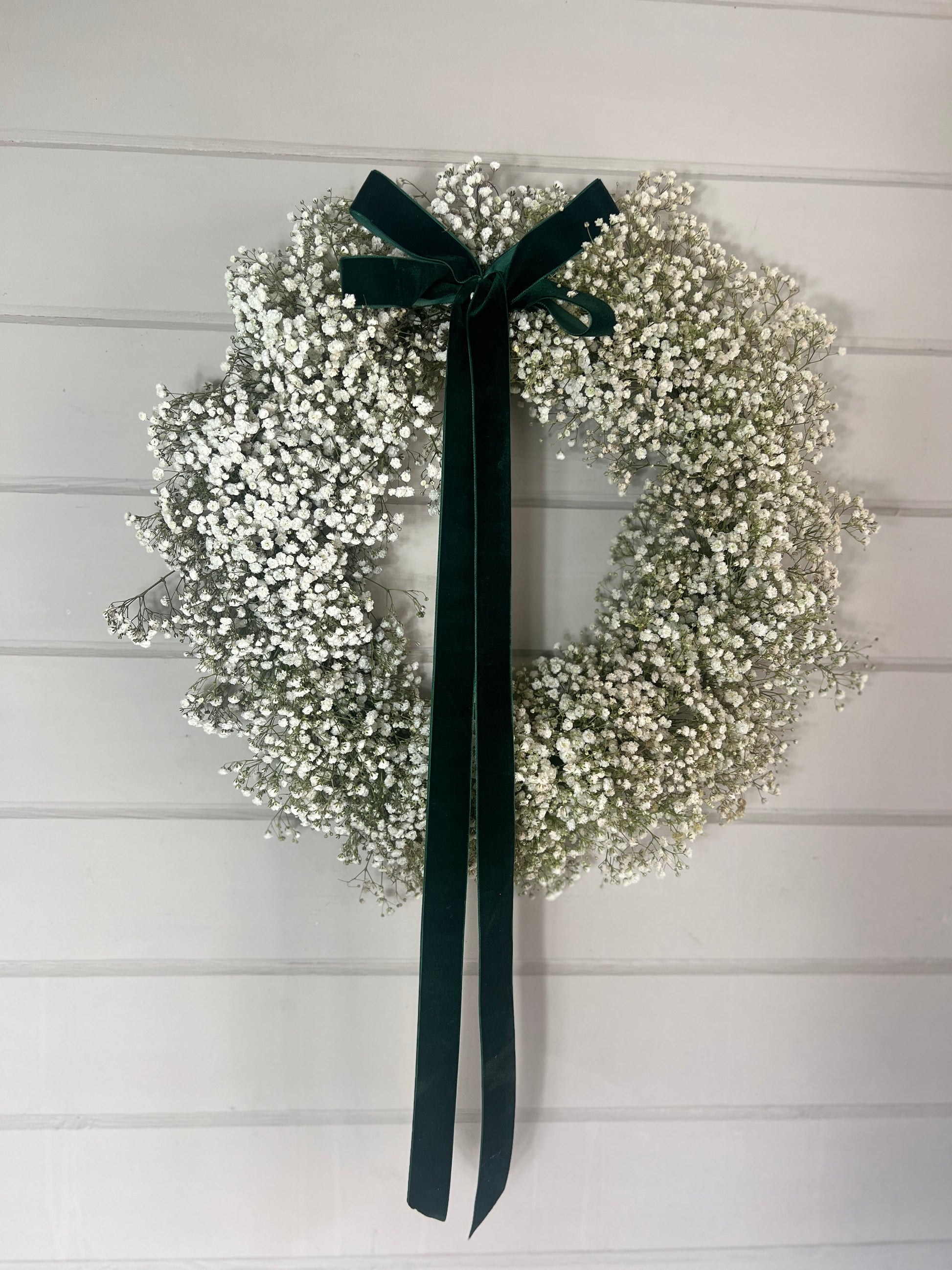 A beautiful hand crafted wreath created using fresh white Gypsophila, carefully bound onto a metal hoop by an expert florist.